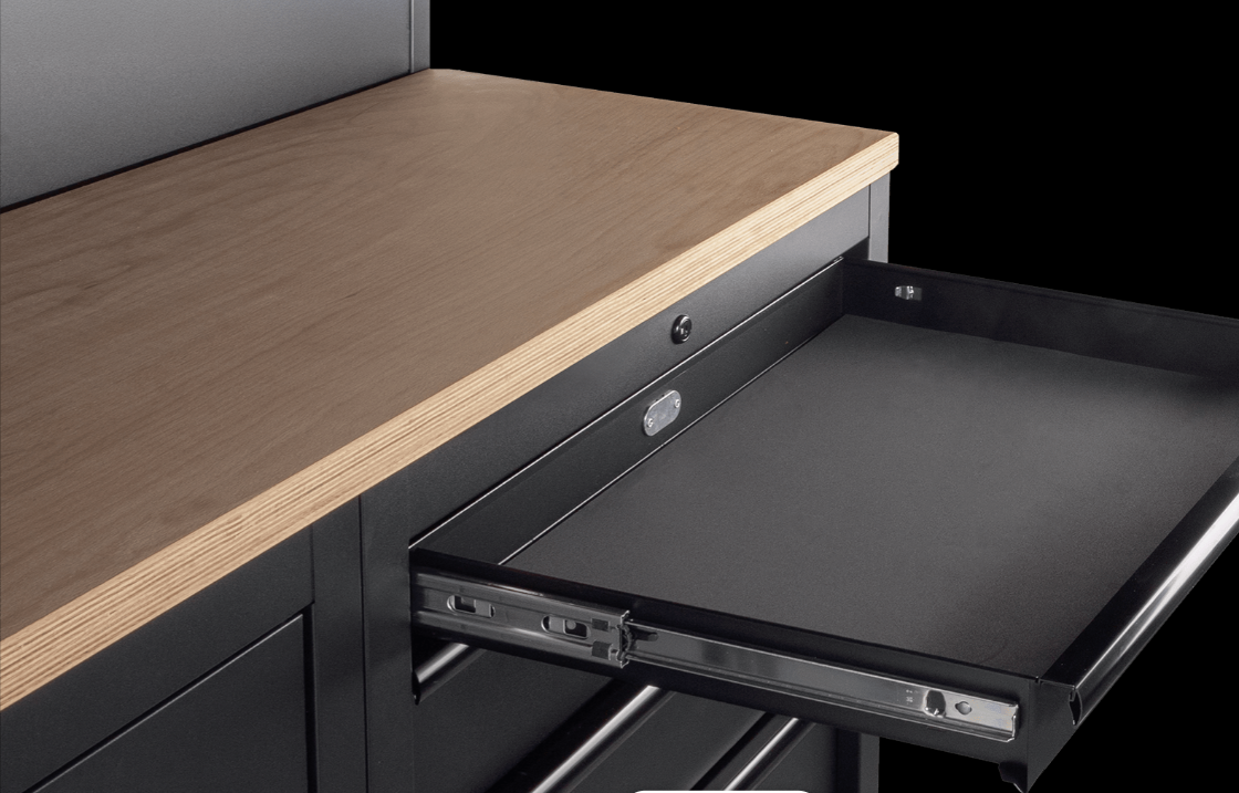 Mobilier d’atelier modulaire pour un assemblage personnalisable en fonction des besoins. Conception autoportante, ne nécessitant ni attaches ni murs de soutien, une installation facile et flexible. Chaque module peut être commandé individuellement. Tiroirs sur roulement à billes avec différentes hauteurs, adaptées à tous les inserts d’outils Kraftwerk (COMPLETO ABS, EVA, EVA3) avec verrouillage centralisé et individuel. Parois porte-outils perforées Euro standard. Plans de travail Multiplex de 35 mm en hêtre d’excellente qualité, usinés en Allemagne et protégés par un vernis d’huile de lin ou plan de travail inox 38 mm en option