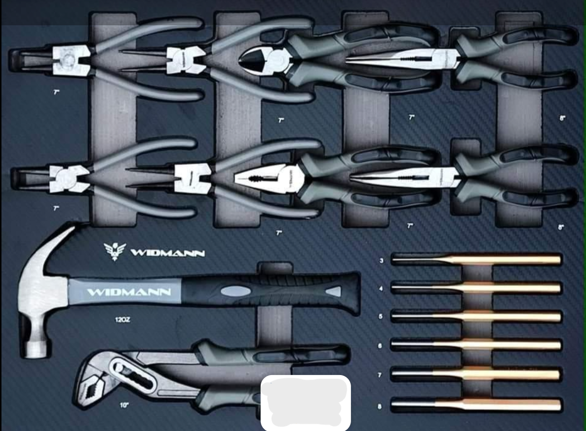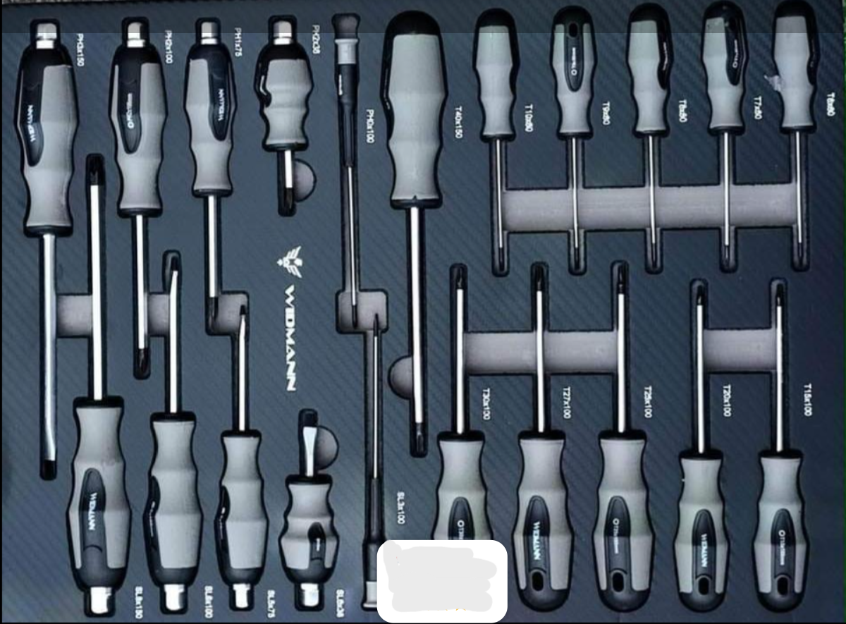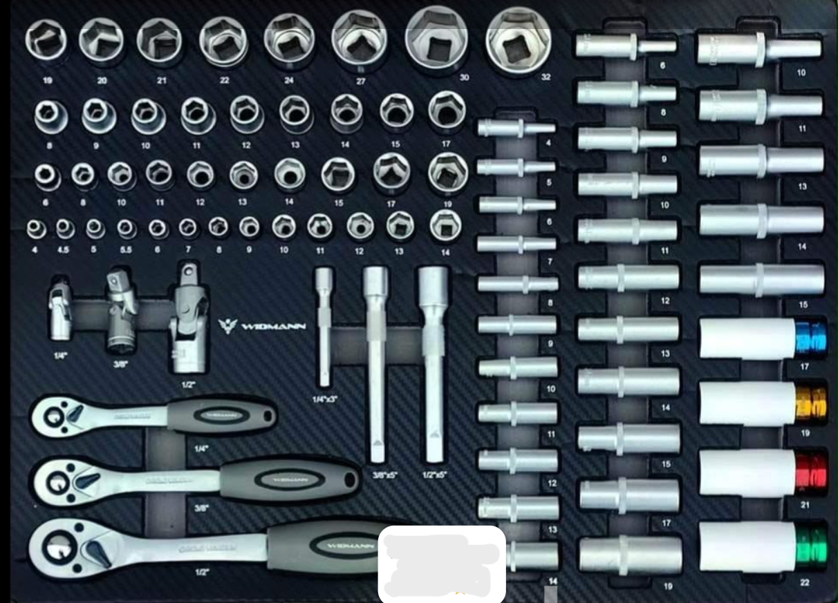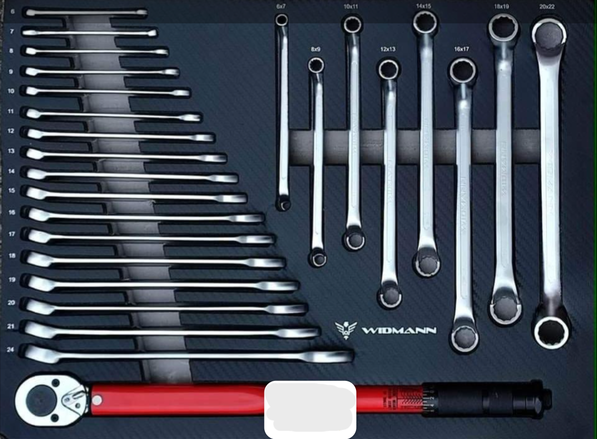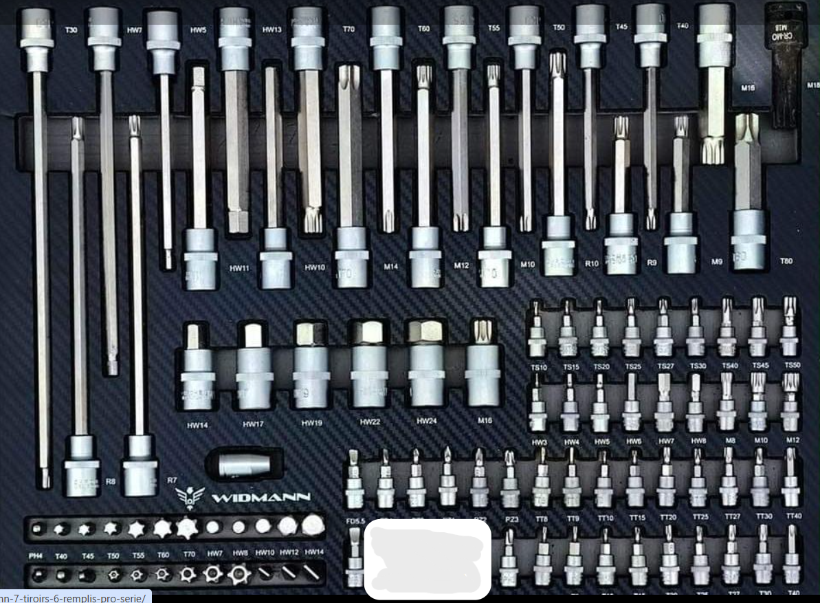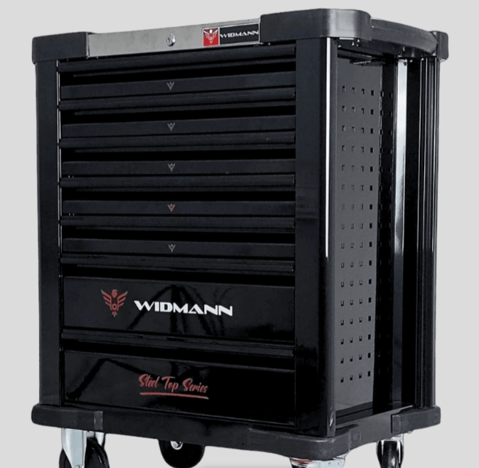 Servante d’atelier de la marque WIDMANN. Nouveau modèle 2025 pro avec 7 tiroirs dont 6 complètement outillés, plus une clé dynamométrique 1/2. PRO STEEL TOP SERIE.